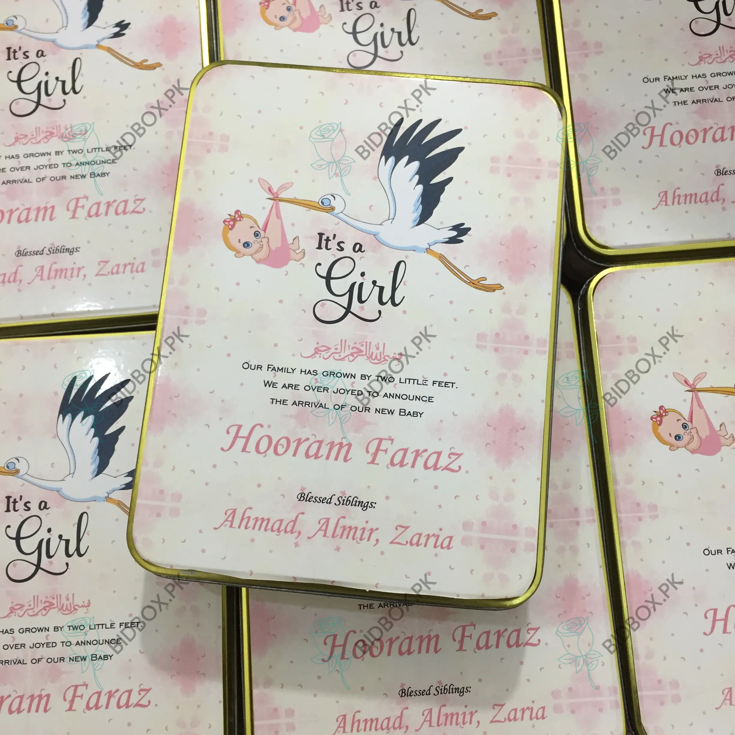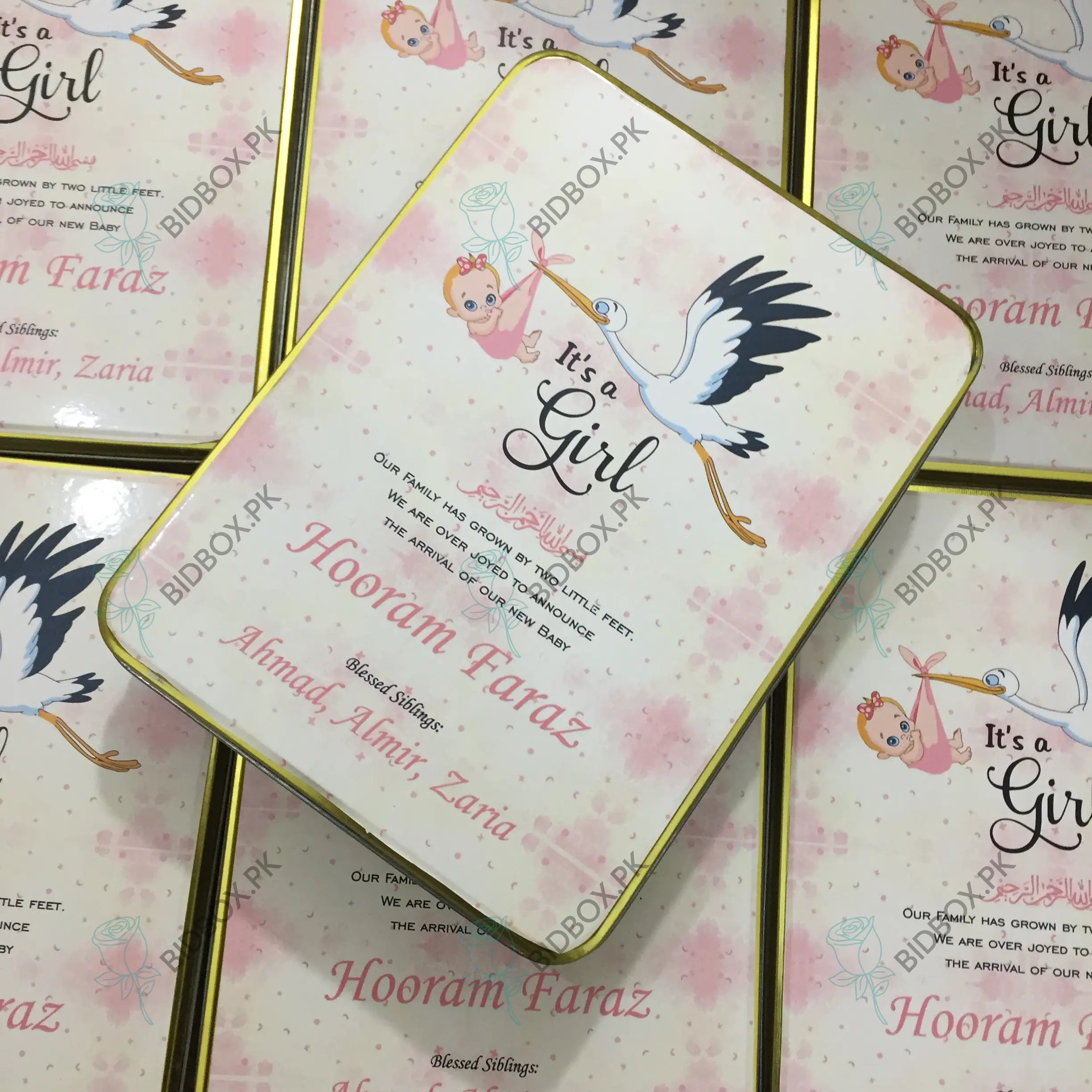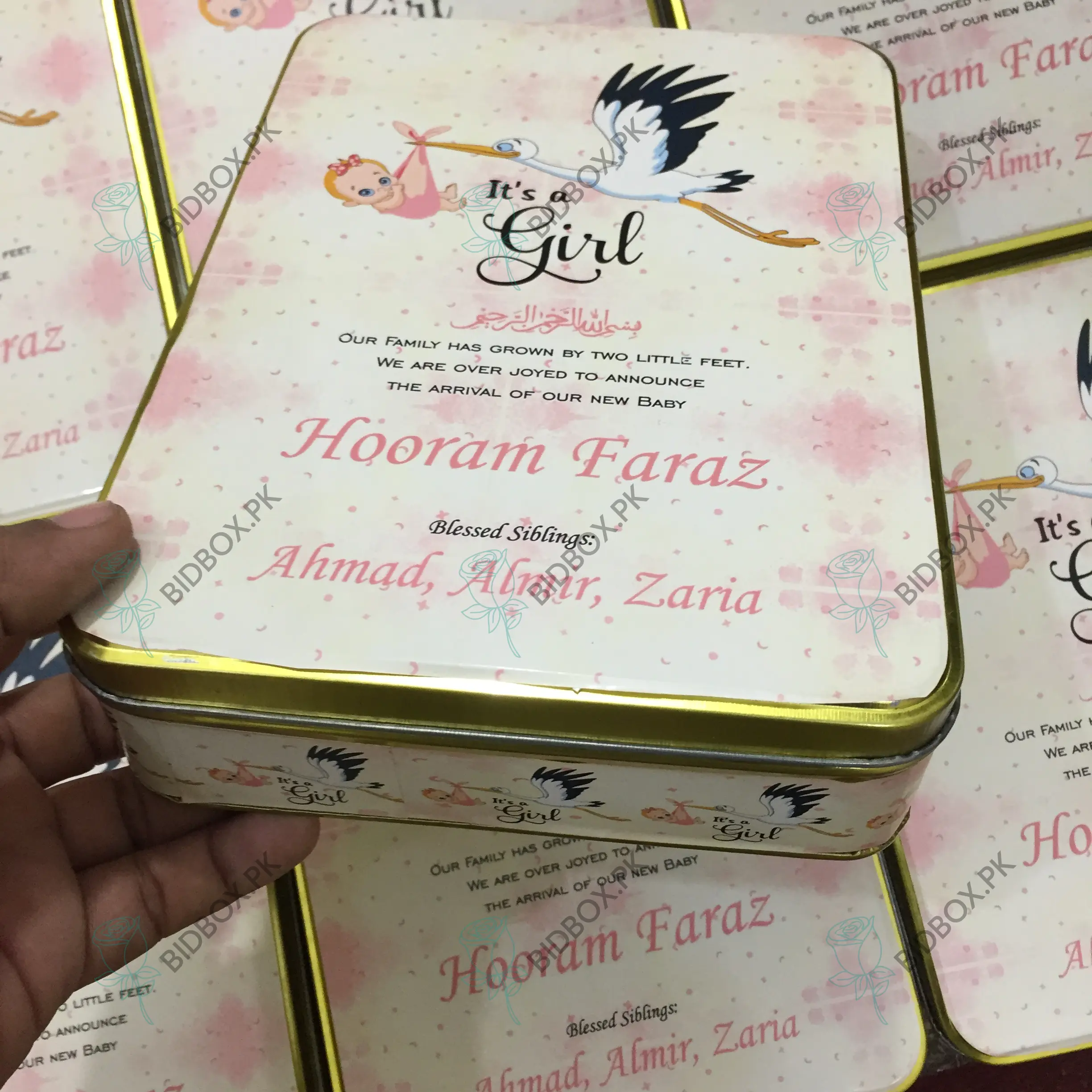 All your wedding needs including 1kg Baby Girl Announcement Sweet Tin Box, Bid box, sweet, favor, Tin, Baby announcement boxes and more…
