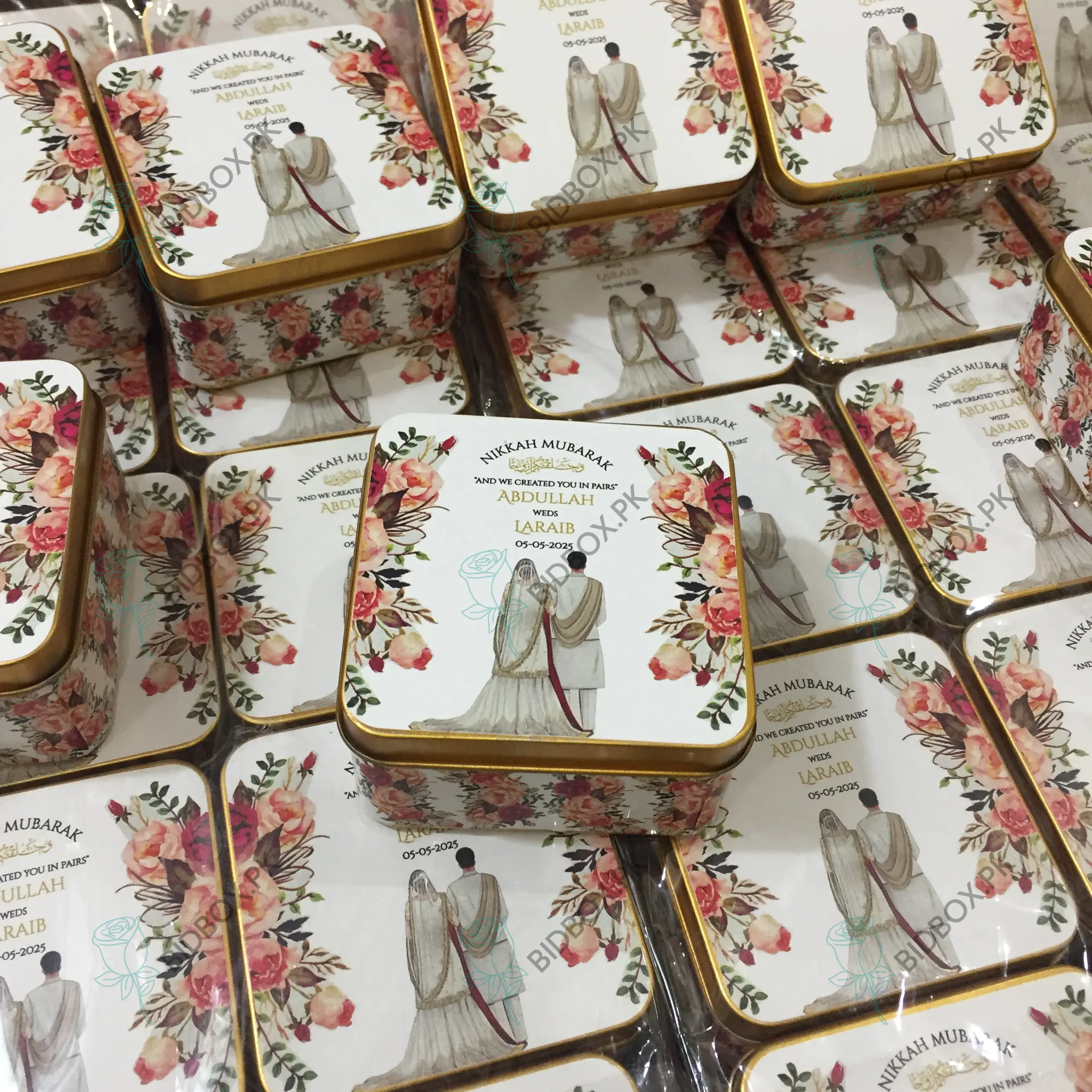 All your wedding needs including Couple Printed Square Tin Bid Box and more…